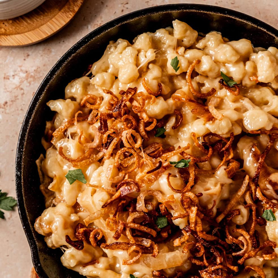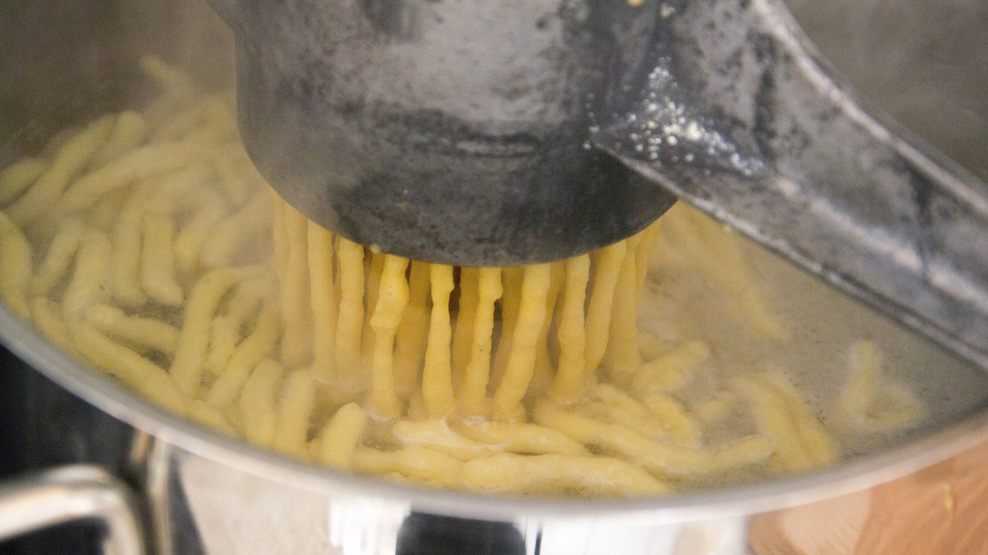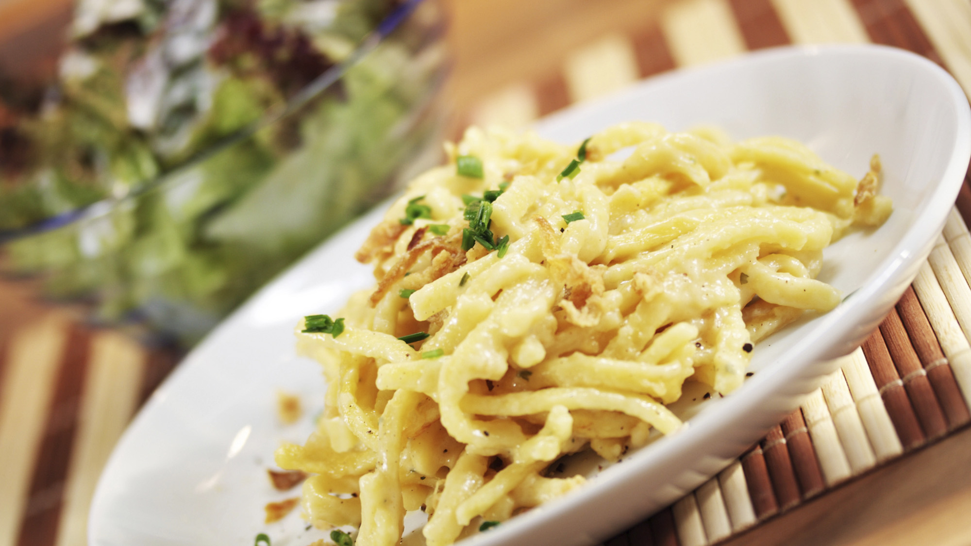 Enjoy some hearty Knoepfle with cheese or meat sauce, just like the farmers and field workers in the Swabian region of Germany.